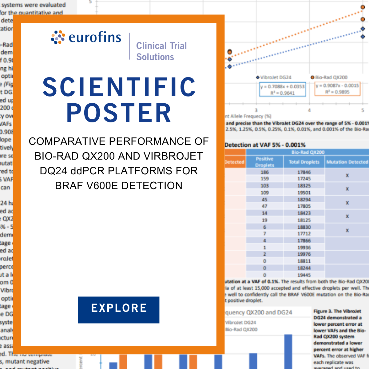 This study compared the Bio-Rad QX200 and VibroJet DQ24 droplet digital PCR (ddPCR) systems for detecting the BRAF V600E mutation across a range of variant allele frequencies (VAFs). Using synthetic DNA samples, both systems showed strong correlation in quantitative detection, though the Bio-Rad QX200 demonstrated slightly higher precision. The VibroJet DQ24 system, however, exhibited superior qualitative sensitivity—detecting lower VAFs than the QX200—and advantages in automation, speed, and multiplexing potential. Overall, the DQ24 offers promising performance for lower VAF detection and higher throughput, while the QX200 remains strong for quantitative accuracy and established workflows.
